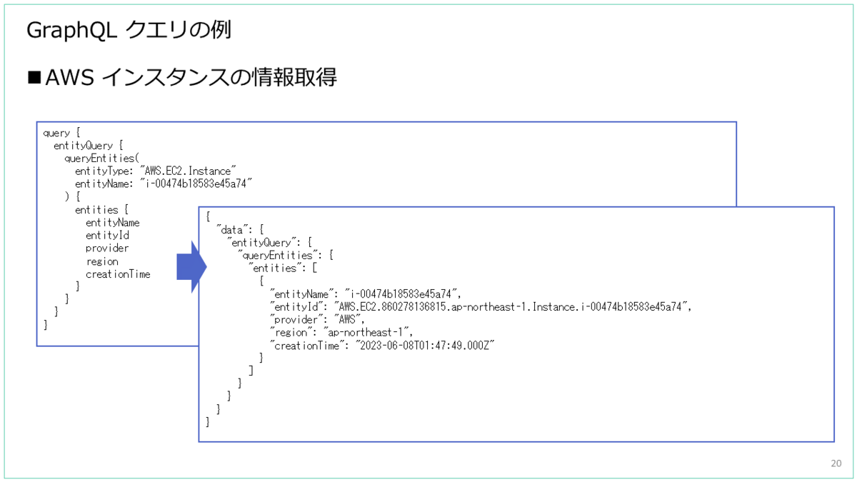ちなみに AWS インスタンスの情報を取得する場合には、同様の GraphQL クエリで EntityType として AWS.EC2.Instance を指定します。