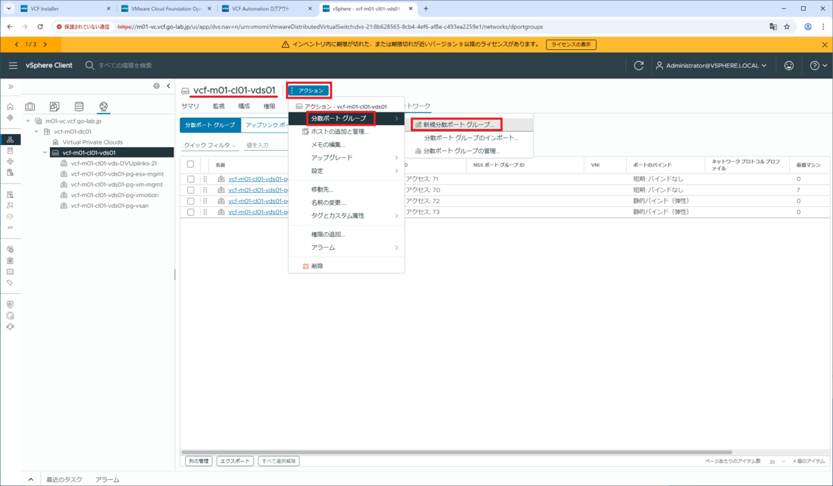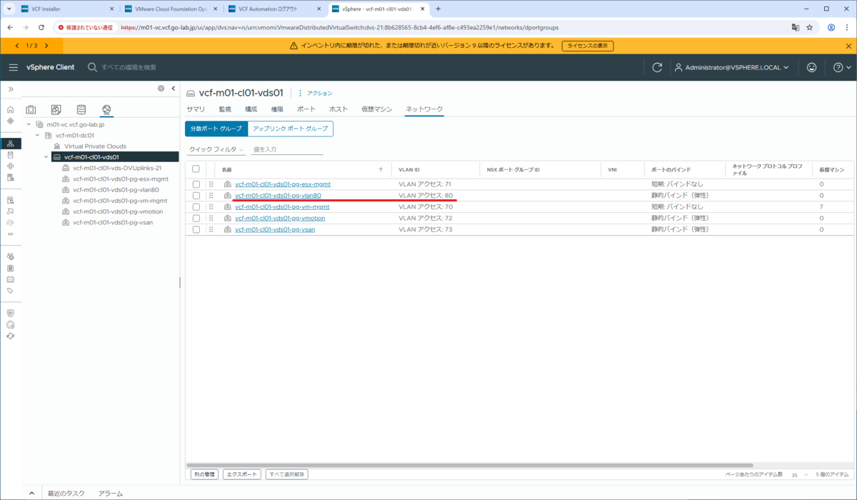 vDS の「ネットワーク」タブを表示すると、作成されている分散ポートグループの一覧を確認できます。この時点では、VCF Installer で展開したまま状態です。
