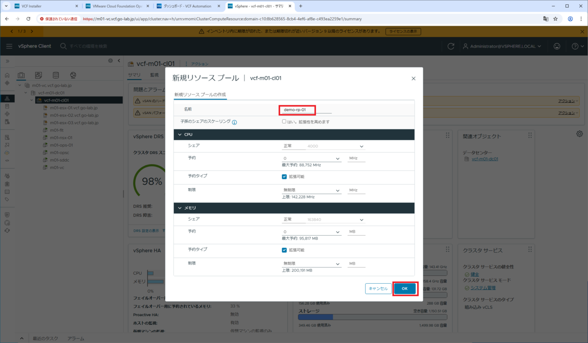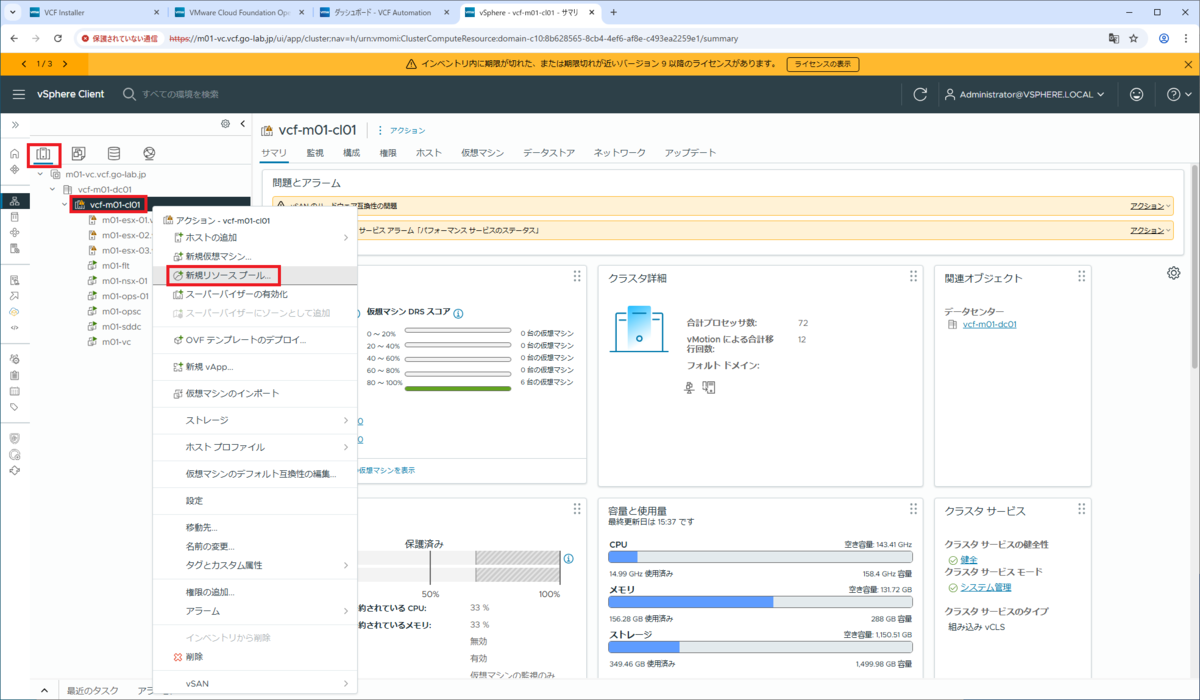「ホストおよびクラスタ」インベントリ → クラスタ(vcf-m01-cl01)を右クリックして、「新規リソース プール」をクリックします。