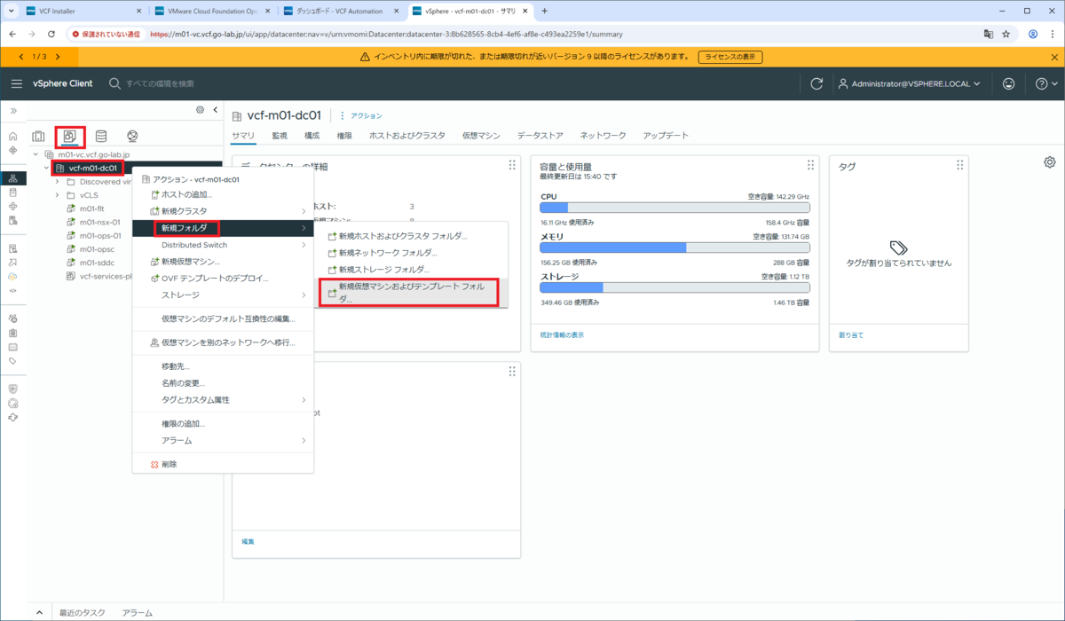 「仮想マシンおよびテンプレート」インベントリ → データセンター(vcf-m01-dc01)を右クリックして、「新規フォルダ」→「新規仮想マシンおよびテンプレート フォルダ」をクリックします。