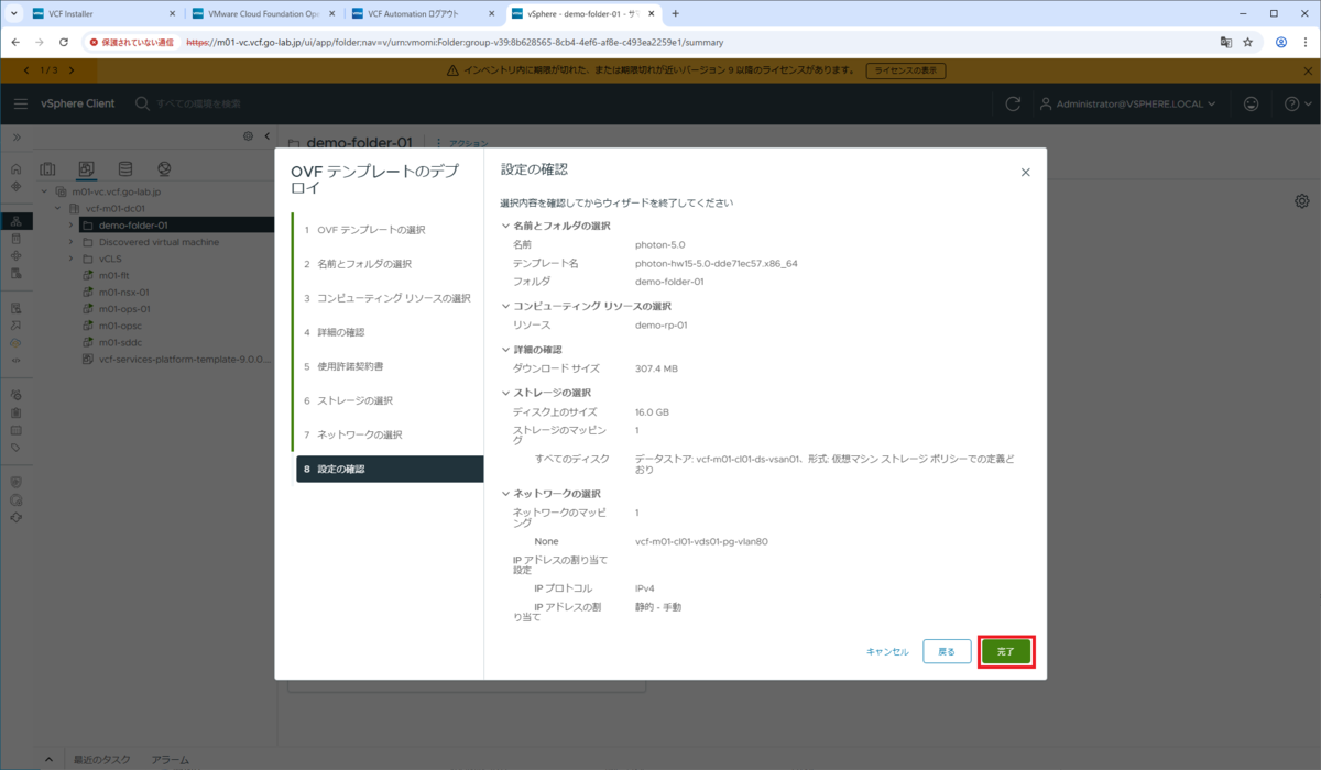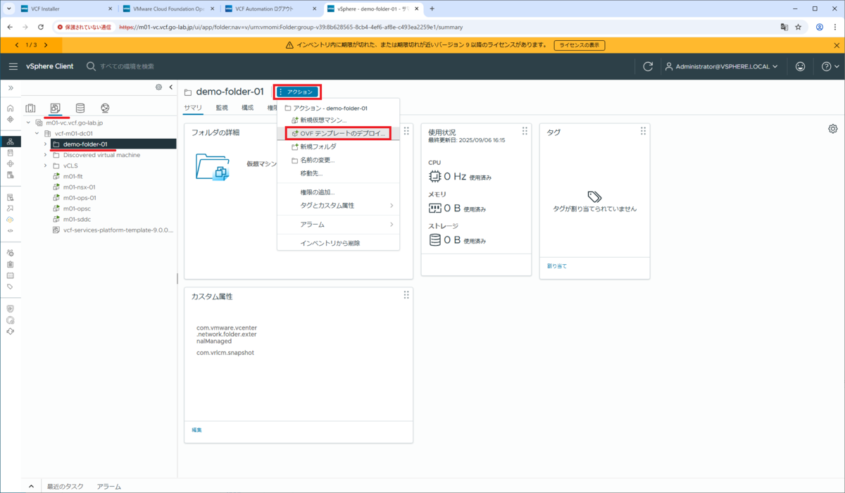 さきほど作成した仮想マシン フォルダ(demo-folder-01)を選択して、「アクション」→「OVF テンプレートのデプロイ」をクリックします。