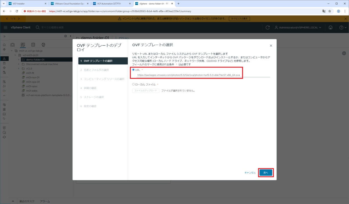本来は、コンテンツ ライブラリを用意して展開すると思いますが、今回はひとまず vCenter インベントリに作成します。