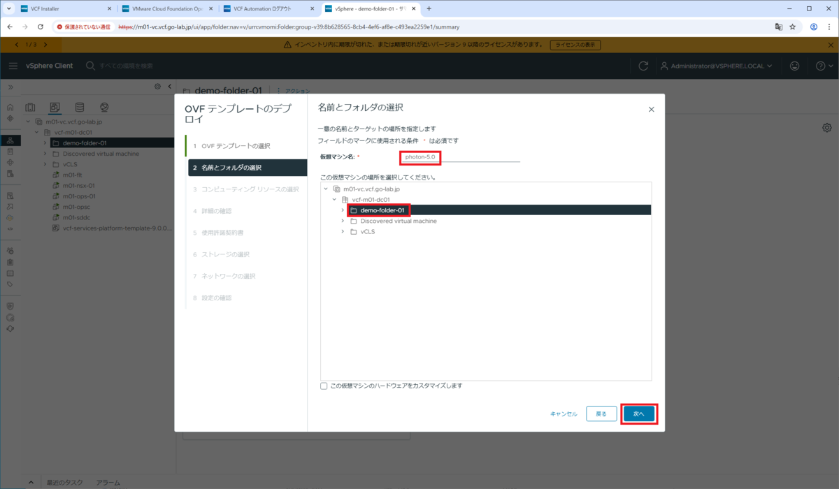 仮想マシン名と、デプロイ先のフォルダを選択して、「次へ」をクリックします。