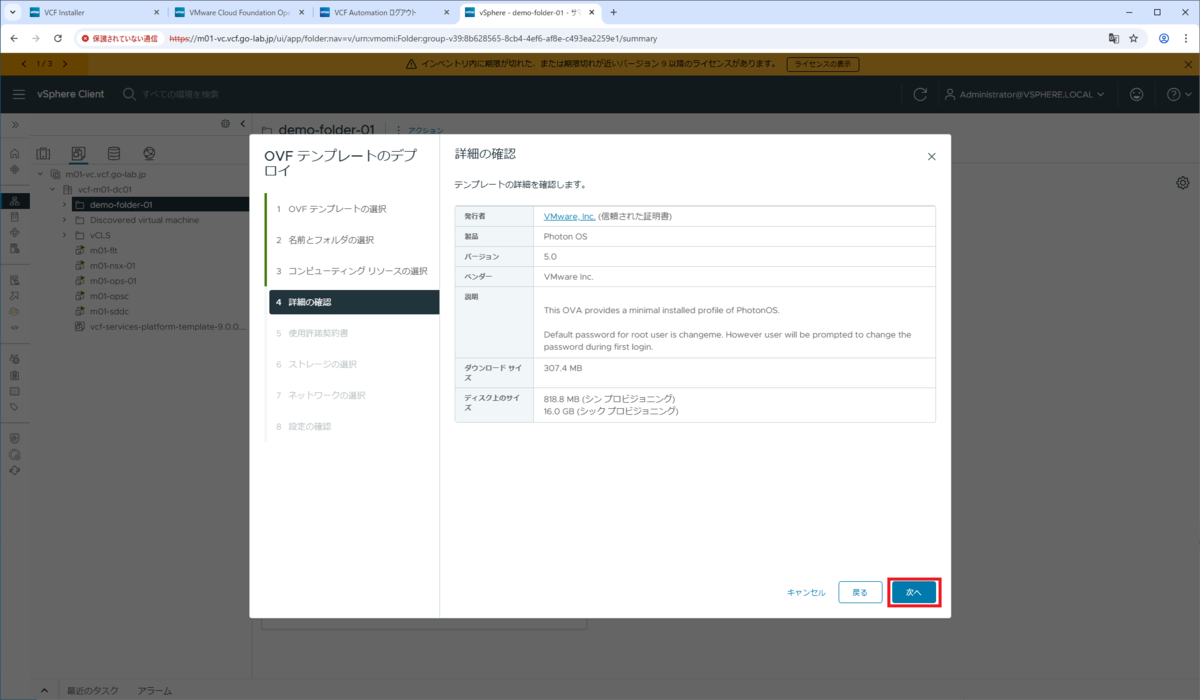 OVA の情報が表示されるので、「次へ」をクリックします。