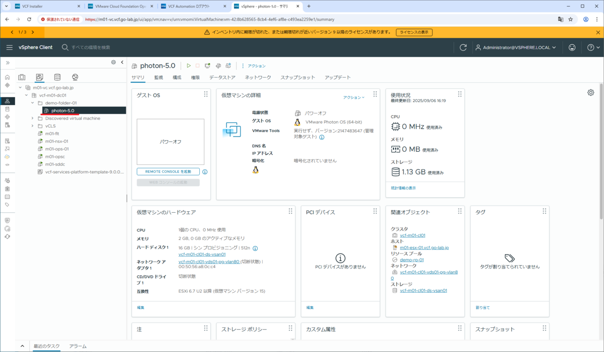 VMware Cloud Foundation(VCF)9.0 の VCF Automation で、VM Apps 組織を作成してみます。今回は、組織にプロジェクトやカタログを作成する準備として、vSphere 側にポートグループや仮想マシンテンプレートなどのオブジェクトを作成します。