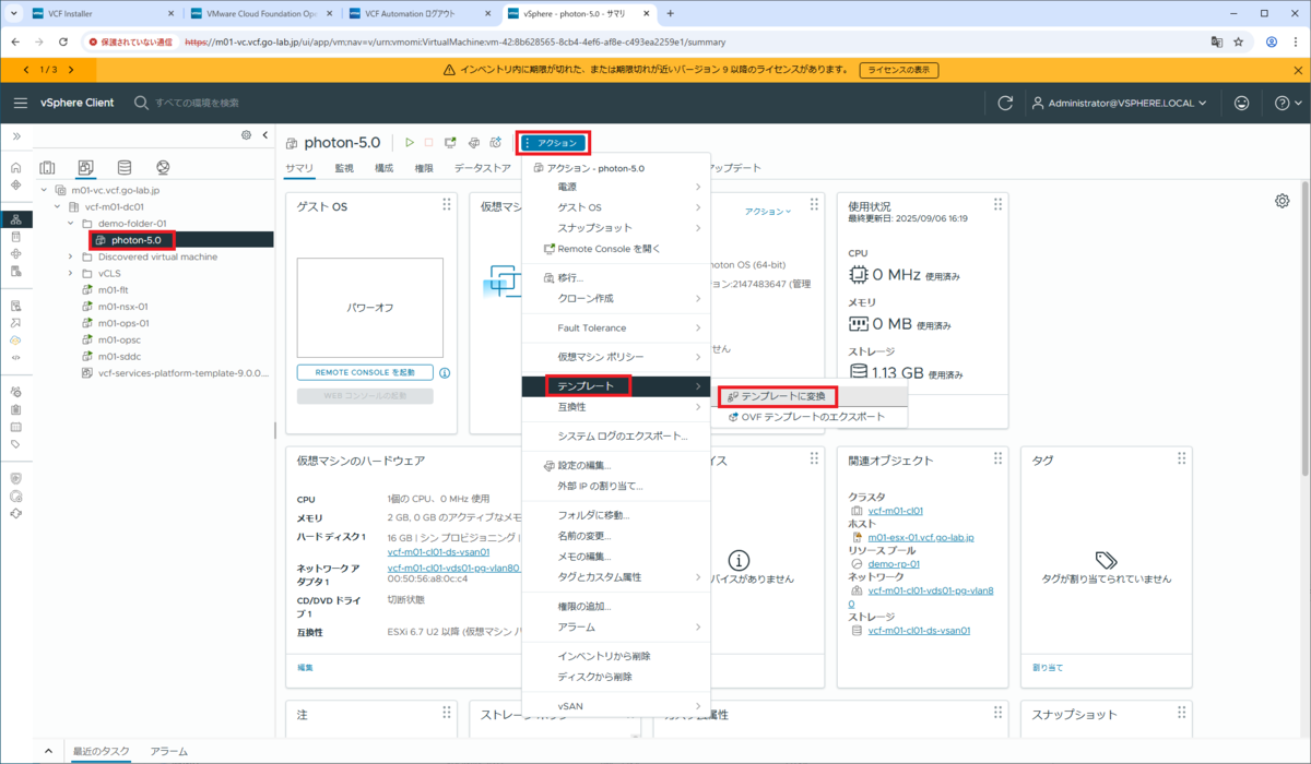 デプロイした仮想マシン(photon-5.0)の「アクション」→「テンプレート」→「テンプレートに変換」をクリックします。