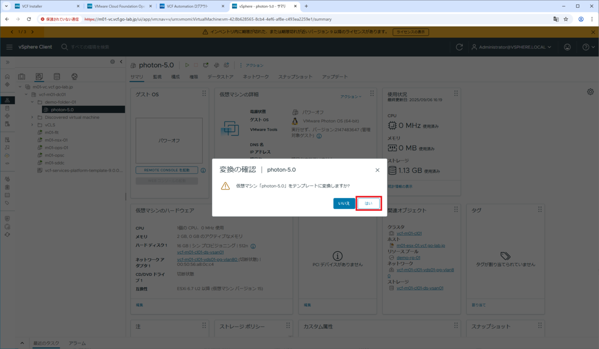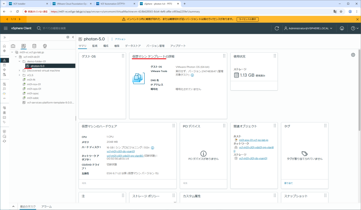 VCF Automation のクラウド テンプレート(ブループリント)展開で使用するため、仮想マシン テンプレートを用意しておきます。今回は、Photon OS 5.0 の OVA をデプロイして、仮想マシン テンプレートに変換します。